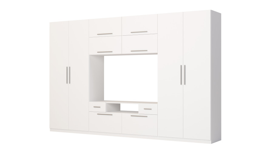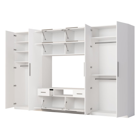 Warum lohnt es sich, SCANDI zu wählen? Wenn Ihnen geräumige Schränke mit Kleiderstangen auf verschiedenen Höhen wichtig sind, die sowohl lange Mäntel als auch kurze Blusen unterbringen – wählen Sie dieses Wohnwand-Modell. SCANDI hat neben den Schränken eine große Anzahl von Regalen, die sich ideal zur Aufbewahrung von Kleidung, Schuhen, Taschen oder Bettwäsche eignen. Außerdem fasst der TV-Schrank einen großen Fernseher und Audio-Video-Geräte. Und falls Ihnen das noch nicht genug wäre, hat SCANDI auch zusätzlichen Stauraum – einen Aufsatz, den Sie ohne Bohren in die Wand montieren können.