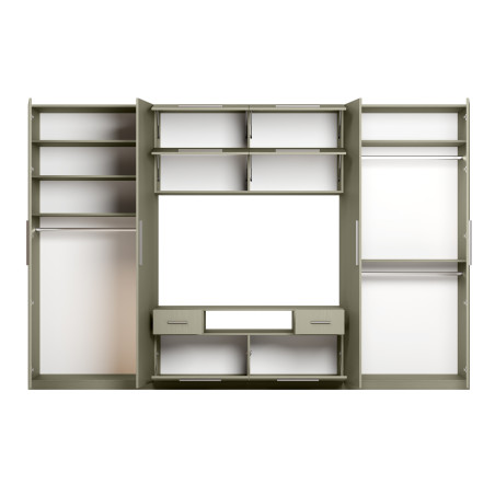 - einem unteren TV-Schrank mit großer offener Fläche für den Fernseher.