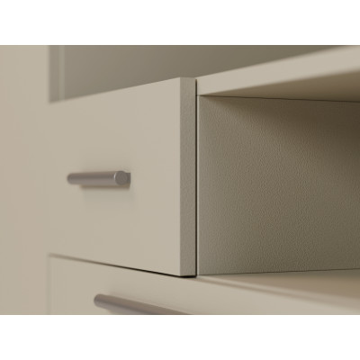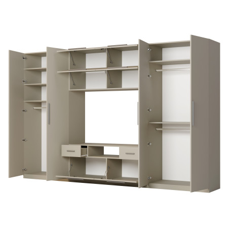Warum lohnt es sich, SCANDI zu wählen? Wenn Ihnen geräumige Schränke mit Kleiderstangen auf verschiedenen Höhen wichtig sind, die sowohl lange Mäntel als auch kurze Blusen unterbringen – wählen Sie dieses Wohnwand-Modell. SCANDI hat neben den Schränken eine große Anzahl von Regalen, die sich ideal zur Aufbewahrung von Kleidung, Schuhen, Taschen oder Bettwäsche eignen. Außerdem fasst der TV-Schrank einen großen Fernseher und Audio-Video-Geräte. Und falls Ihnen das noch nicht genug wäre, hat SCANDI auch zusätzlichen Stauraum – einen Aufsatz, den Sie ohne Bohren in die Wand montieren können.