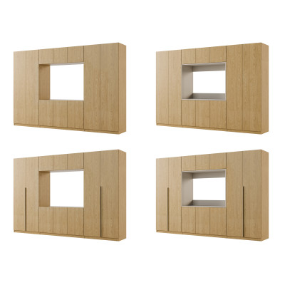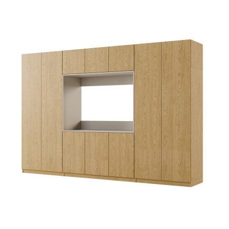 - verschließbaren Aufsätzen mit Einlegeböden über die gesamte Breite des Sets, wodurch die Gesamthöhe der Wohnwand bis zu 240 cm beträgt.