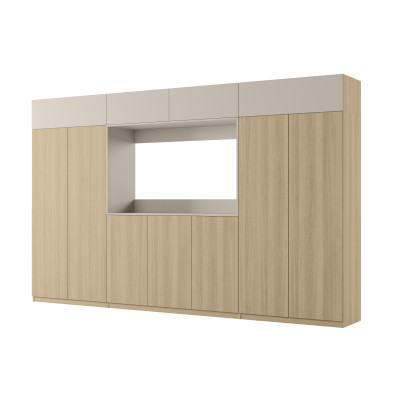 - verschließbaren Aufsätzen mit Einlegeböden über die gesamte Breite des Sets, wodurch die Gesamthöhe der Wohnwand bis zu 240 cm beträgt.