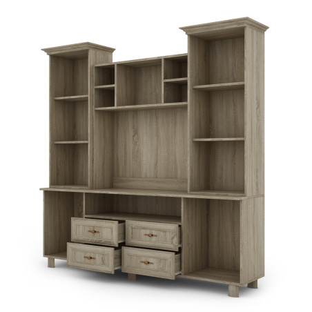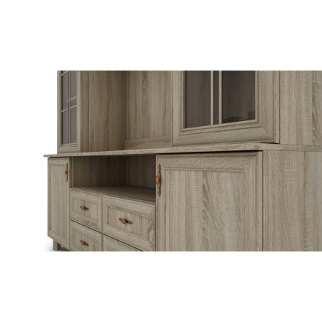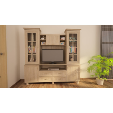 Next to the TV space are two display cases, which offer additional space for storing and displaying collectibles. Each of the display cases is equipped with shelves where you can place various ornaments, memorabilia or collections. Thanks to the glazed fronts, these items are clearly visible, creating a pleasant visual effect.