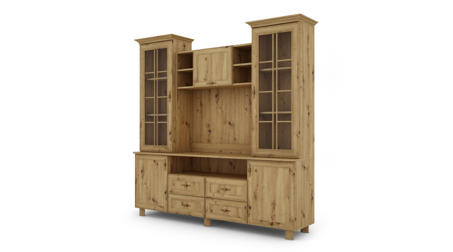 Next to the TV space are two display cases, which offer additional space for storing and displaying collectibles. Each of the display cases is equipped with shelves where you can place various ornaments, memorabilia or collections. Thanks to the glazed fronts, these items are clearly visible, creating a pleasant visual effect.