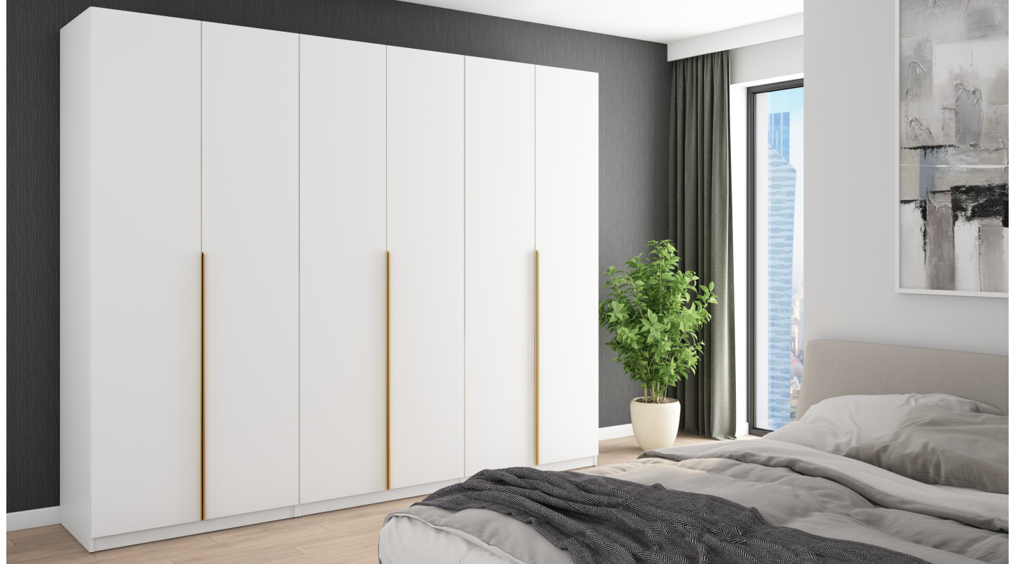 This unique wardrobe, with a width of 282 cm, height of 230 cm and depth of 59 cm, was created to meet your storage needs. Its solid construction and thoughtful equipment will make sorting clothes and accessories pleasant and easy.