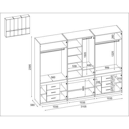 Wardrobe 310/240 - hanging rods, internal shelves, internal drawers, mirror