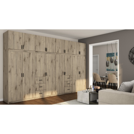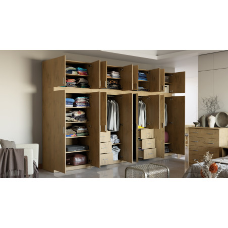 Are you looking for a very spacious wardrobe that will allow you to maintain order among the wardrobe items of your entire family? Choose the 380/240 wardrobe, which you can divide into segments. The spaces have been equipped with metal hanging rails and high shelves that facilitate storing clothes, additionally with top units that will accommodate rarely used items. Thanks to spacious drawers, you can easily find any item you are looking for.