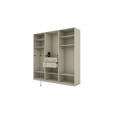 The wardrobe offers a thoughtful shelf arrangement that allows comfortable storage of clothes, accessories, and home textiles. Built-in spacious drawers will accommodate all small accessories, while rails and pantographs will ensure easy access to hanging clothes – even in the higher parts of the furniture.