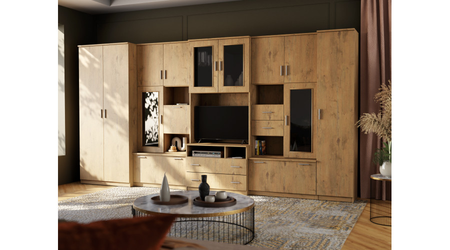 The furniture consists of a large wardrobe with hanging rod, linen cabinet with five shelves, glass display cabinets, drawers, bar cabinet, open niches and a large recess for TV. It is an excellent solution for people who need a lot of storage space for various items, from clothes to books, decorations or electronic equipment. The LENA wall unit allows you to maintain order in the room while providing easy access to needed items.