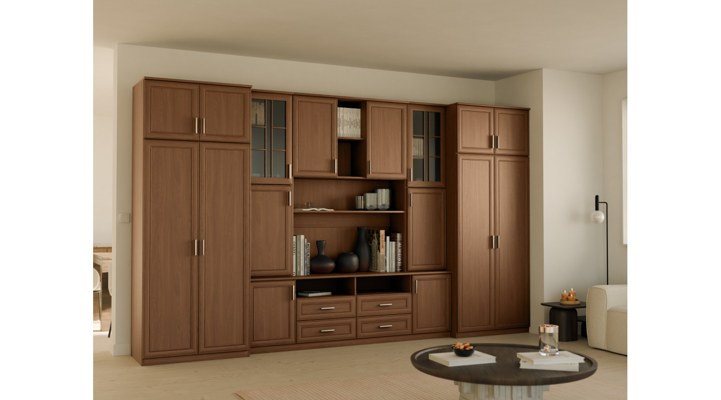 Thanks to its elegance and solid construction, the SAWA wall unit is ideal for traditionally decorated living rooms. Its classic look emphasizes the character of the arrangement. The use of high-quality wood-colored materials adds warmth and coziness to the room.