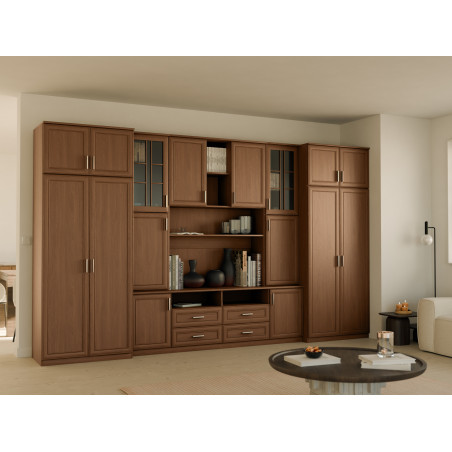 Do you appreciate traditional arrangements and want to furnish your living room in this style? The SAWA wall unit with closet, cabinets, display case, bar and spacious drawers can be an excellent choice.