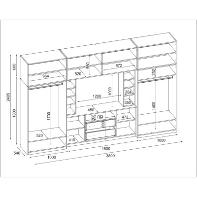 Dako is a very wide (3.80 m) and very tall (2.40 m) wall unit. It has deeper than standard extensions (0.36 m) and wardrobes (0.55 m) with rods for clothes hangers, a linen closet with 5 shelves, glass display cases, drawers, a bar, open and closed niches, and even a large media niche.