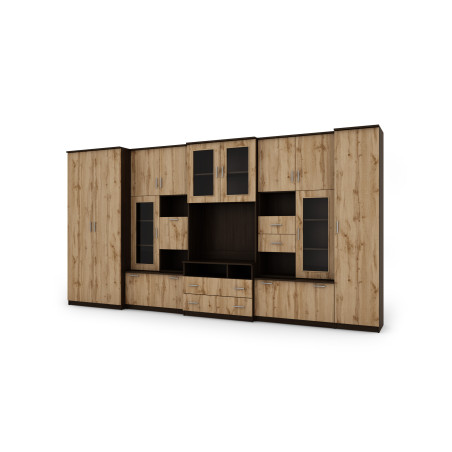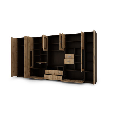 The furniture consists of a large wardrobe with hanging rod, linen cabinet with five shelves, glass display cabinets, drawers, bar cabinet, open niches and a large recess for TV. It is an excellent solution for people who need a lot of storage space for various items, from clothes to books, decorations or electronic equipment. The LENA wall unit allows you to maintain order in the room while providing easy access to needed items.