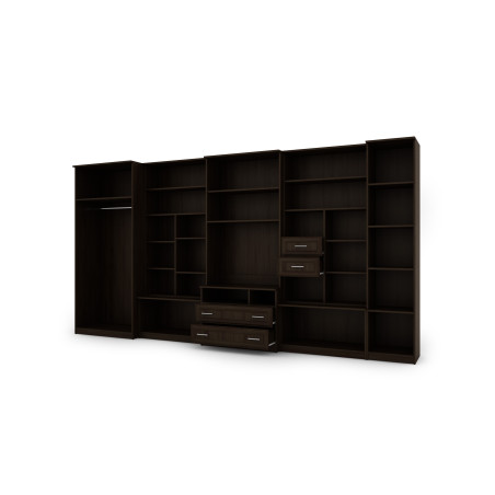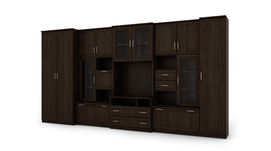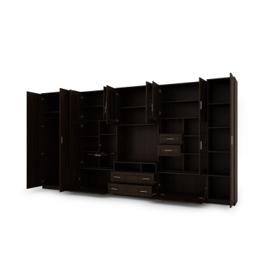 The furniture consists of a large wardrobe with hanging rod, linen cabinet with five shelves, glass display cabinets, drawers, bar cabinet, open niches and a large recess for TV. It is an excellent solution for people who need a lot of storage space for various items, from clothes to books, decorations or electronic equipment. The LENA wall unit allows you to maintain order in the room while providing easy access to needed items.