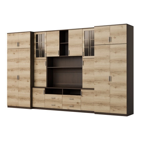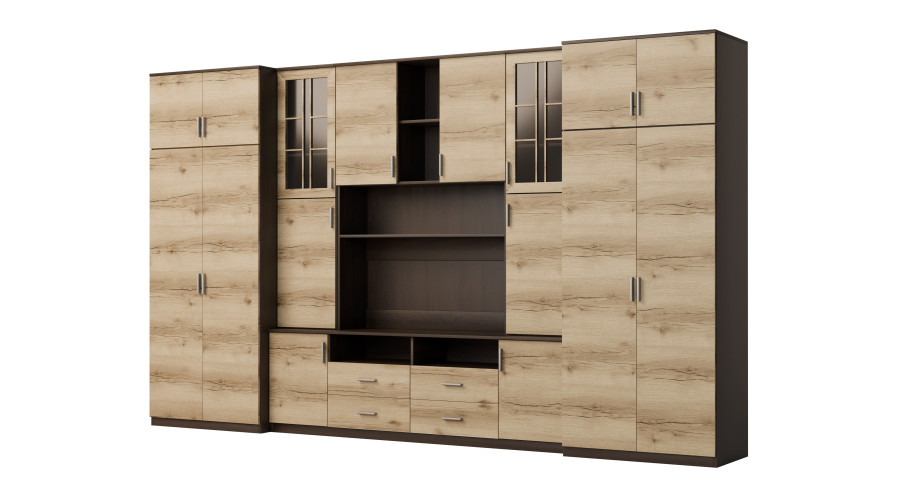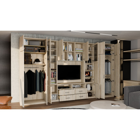 The set is designed for people who want to make maximum use of available space. In the presented wall unit you will find everything you need – a wardrobe with a rod for clothes hangers, a linen cabinet with 5 shelves, glass display cases, drawers, a bar, open and closed recesses behind doors, and even a large TV recess with space at the bottom for a TV decoder, etc.