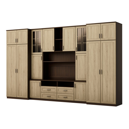 The set is designed for people who want to make maximum use of available space. In the presented wall unit you will find everything you need – a wardrobe with a rod for clothes hangers, a linen cabinet with 5 shelves, glass display cases, drawers, a bar, open and closed recesses behind doors, and even a large TV recess with space at the bottom for a TV decoder, etc.