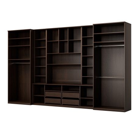 The SAWA wall unit is an extremely practical piece of furniture. It is very wide (3.90 m) and very tall (2.32 m)! It has deeper than standard extensions (0.36 m) as well as cabinets (0.55 m).