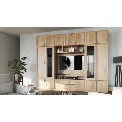 This is a wall unit that can hold a lot – behind elegant, closed fronts you can hide all the things that shouldn't be visible. Glass display cabinets will allow you to effectively showcase your favorite decorations, and the TV area has been thoughtfully designed to comfortably accommodate television and multimedia equipment.