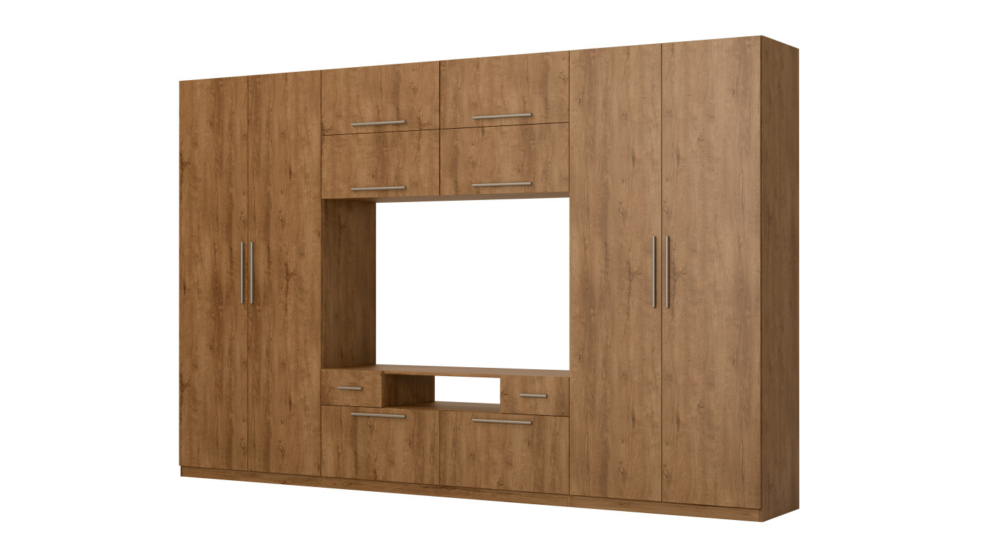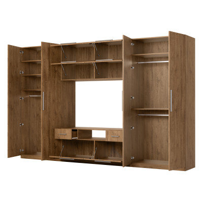 Why choose SCANDI? If you value spacious wardrobes with hanging rails at different heights that can accommodate both long coats and short blouses – choose this wall unit model. SCANDI, apart from wardrobes, has a large number of shelves that are perfect for storing clothes, shoes, handbags or bedding. Moreover, the TV cabinet will fit a large television and audio-video equipment. And if that's not enough for you, SCANDI also has additional storage space – an extension that you can mount without drilling holes in the wall.