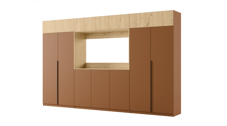 Dako is a very wide (3.80 m) and very tall (2.40 m) wall unit. It has deeper than standard extensions (0.36 m) and wardrobes (0.55 m) with rods for clothes hangers, a linen closet with 5 shelves, glass display cases, drawers, a bar, open and closed niches, and even a large media niche.