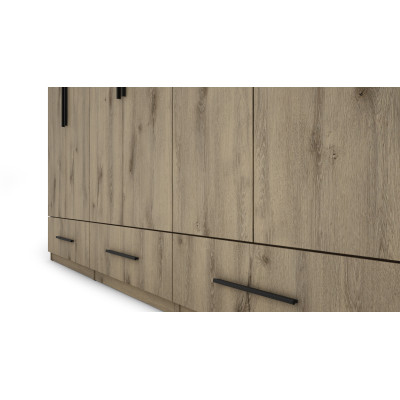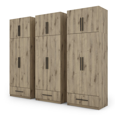 La fonctionnalité se reflète dans les étagères, tringles et tiroirs. L'ensemble se compose de 6 segments séparés (3 armoires basses et 3 extensions), qui ensemble créent une armoire spacieuse. Chaque segment se caractérise par une fonctionnalité et un objectif différents, et en combinant tous, vous obtiendrez un ensemble inhabituellement spacieux avec de la place pour toutes vos affaires. Si vous le souhaitez, les armoires peuvent également être placées séparément, ce qui est leur avantage incontestable.