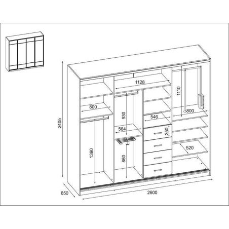 Armoire coulissante 4D/260 - cintre pantalons, pantographe, tiroirs, étagères