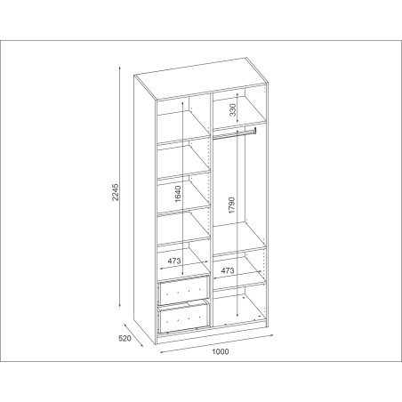 À l'intérieur de l'armoire, vous trouverez tout ce qui est nécessaire pour un rangement confortable. L'armoire est équipée d'une barre à vêtements parfaite pour suspendre les vêtements plus longs tels que manteaux, robes ou costumes. À côté se trouvent des étagères pratiques, qui conviennent comme espace pour les pulls, t-shirts, sacs ou linge de lit. L'ensemble est complété par des tiroirs qui permettent de maintenir l'ordre dans les petits éléments de garde-robe comme la lingerie, les chaussettes ou les ceintures.