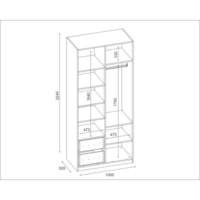 À l'intérieur de l'armoire, vous trouverez tout ce qui est nécessaire pour un rangement confortable. L'armoire est équipée d'une barre à vêtements parfaite pour suspendre les vêtements plus longs tels que manteaux, robes ou costumes. À côté se trouvent des étagères pratiques, qui conviennent comme espace pour les pulls, t-shirts, sacs ou linge de lit. L'ensemble est complété par des tiroirs qui permettent de maintenir l'ordre dans les petits éléments de garde-robe comme la lingerie, les chaussettes ou les ceintures.