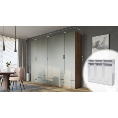 Dans la partie centrale de l'armoire se trouve une barre à cintres qui permet un rangement pratique des vêtements suspendus comme les blazers, chemises, robes et vestes. Au-dessus sont disposées des étagères qui sont idéales pour ranger les vêtements pliés, la literie, les serviettes ou les accessoires saisonniers. À la base de l'armoire se trouvent des tiroirs spacieux – leur extension complète et le système de fermeture douce garantissent le confort d'utilisation et la durabilité pendant des années.