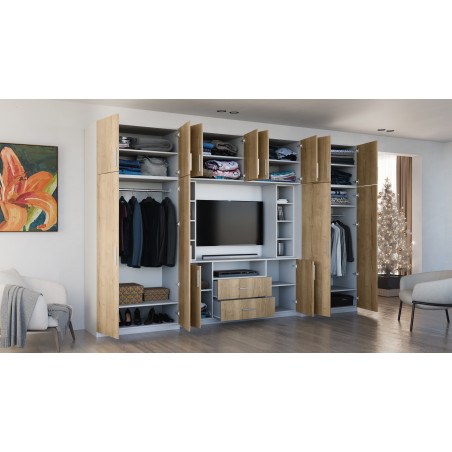 Dako est un meuble très large (3,80 m) et très haut (2,40 m). Il a des rehausseurs plus profonds que la normale (0,36 m) et des armoires (0,55 m) avec des barres à cintres, une lingerie avec 5 étagères, des vitrines en verre, des tiroirs, un bar, des niches ouvertes et fermées, et même une grande niche multimédia.