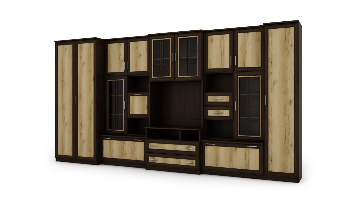 Le meuble se compose d'une grande armoire avec barre de penderie, d'une lingerie avec cinq étagères, de vitrines en verre, de tiroirs, d'un bar, de niches ouvertes et d'une grande niche pour la télévision. C'est une excellente solution pour les personnes qui ont besoin de beaucoup d'espace de rangement pour divers objets, des vêtements aux livres, décorations ou équipements électroniques. Le meuble TV LENA permet de maintenir l'ordre dans la pièce tout en offrant un accès facile aux choses nécessaires.