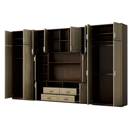 L'ensemble est destiné aux personnes qui souhaitent utiliser au maximum l'espace disponible. Dans l'ensemble mural présenté, vous trouverez tout ce dont vous avez besoin – une armoire à vêtements avec tringle pour cintres, une lingerie avec 5 étagères, des vitrines en verre, des tiroirs, un bar, des niches ouvertes et fermées derrière les portes, et même une grande niche pour téléviseur avec espace en bas pour décodeur TV etc.