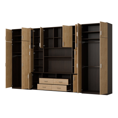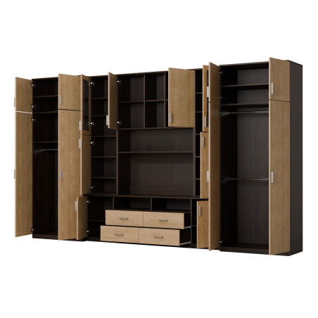 L'ensemble est destiné aux personnes qui souhaitent utiliser au maximum l'espace disponible. Dans l'ensemble mural présenté, vous trouverez tout ce dont vous avez besoin – une armoire à vêtements avec tringle pour cintres, une lingerie avec 5 étagères, des vitrines en verre, des tiroirs, un bar, des niches ouvertes et fermées derrière les portes, et même une grande niche pour téléviseur avec espace en bas pour décodeur TV etc.