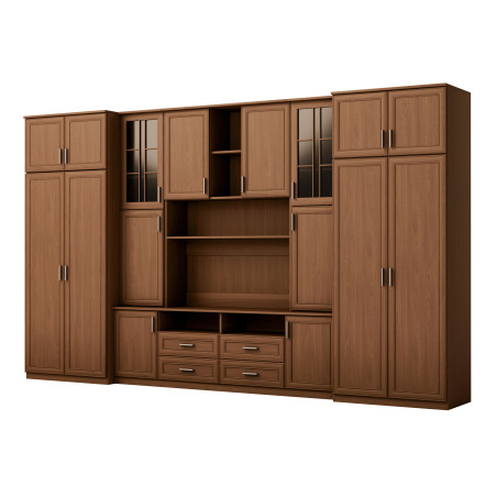 L'ensemble est destiné aux personnes qui souhaitent utiliser au maximum l'espace disponible. Dans l'ensemble mural présenté, vous trouverez tout ce dont vous avez besoin – une armoire à vêtements avec tringle pour cintres, une lingerie avec 5 étagères, des vitrines en verre, des tiroirs, un bar, des niches ouvertes et fermées derrière les portes, et même une grande niche pour téléviseur avec espace en bas pour décodeur TV etc.