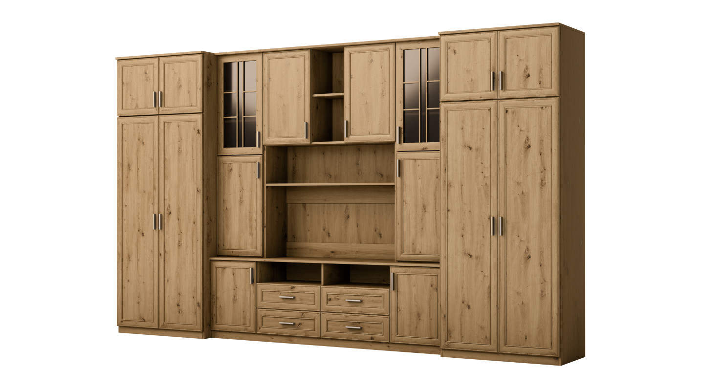 L'ensemble est destiné aux personnes qui souhaitent utiliser au maximum l'espace disponible. Dans l'ensemble mural présenté, vous trouverez tout ce dont vous avez besoin – une armoire à vêtements avec tringle pour cintres, une lingerie avec 5 étagères, des vitrines en verre, des tiroirs, un bar, des niches ouvertes et fermées derrière les portes, et même une grande niche pour téléviseur avec espace en bas pour décodeur TV etc.