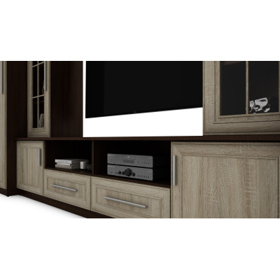 - Extensions TV avec un grand nombre d'étagères ouvertes, fermées et deux grandes vitrines en verre.