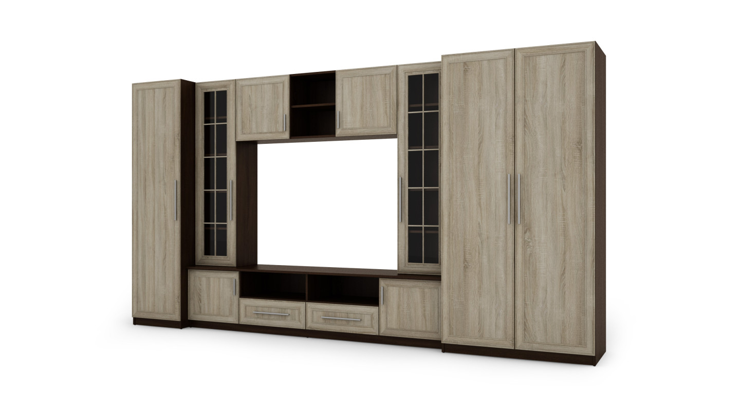 L'ensemble mural NEPTUN a été conçu pour le salon ou l'espace de vie, où il doit jouer un rôle important dans l'organisation de l'espace et le stockage de divers objets. L'ensemble mural se compose d'éléments tels que : placards, étagères, armoires, espace multimédia et autres modules qui peuvent être adaptés aux besoins et préférences individuels.