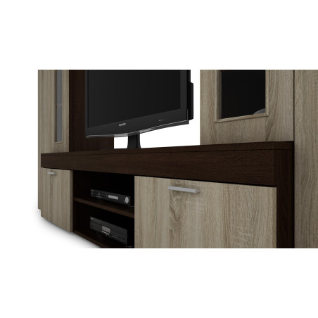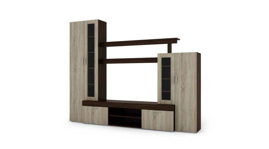 Le meuble TV Apollo est un ensemble de mobilier qui s'harmonise ensemble. Fabriqués à partir de panneaux de mobilier de la plus haute qualité, résistants aux rayures et à l'humidité. Leurs bords sont recouverts d'un chant PCV résistant. L'ensemble se compose de plusieurs éléments comprenant : meuble TV, étagères, vitrine et placards.