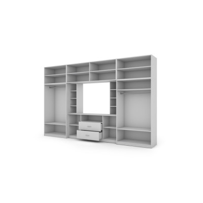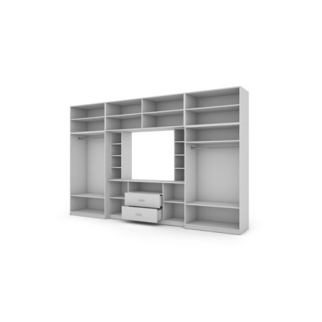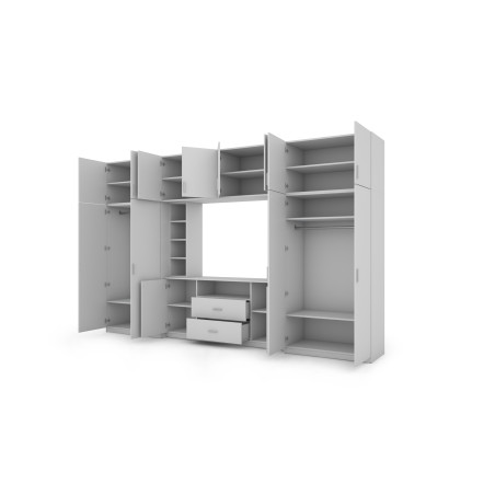 - rehausseurs fermants avec étagères sur toute la largeur de l'ensemble, grâce auxquels la hauteur totale du meuble de rangement atteint 240 cm.