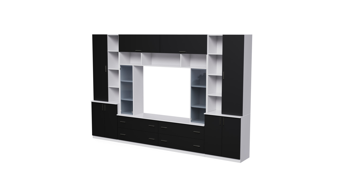 Vous cherchez un meuble élégant, fonctionnel et spacieux qui sera le cœur de votre salon ? Optez pour le meuble TV Modena – impressionnant en termes de design et d'espace. Large de 340 cm et haut de 220 cm, le meuble TV Modena se présente de manière exceptionnelle, offrant une énorme quantité d'espace de rangement.