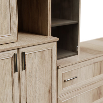 L'espace TV a été conçu en pensant aux systèmes multimédias modernes – vous pouvez librement installer une télévision, un décodeur, une console ou une barre de son, et des étagères et armoires supplémentaires aideront à cacher les câbles et accessoires.