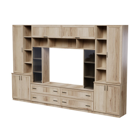 Vous cherchez un meuble élégant, fonctionnel et spacieux qui sera le cœur de votre salon ? Optez pour le meuble TV Modena – impressionnant en termes de design et d'espace. Large de 340 cm et haut de 220 cm, le meuble TV Modena se présente de manière exceptionnelle, offrant une énorme quantité d'espace de rangement.