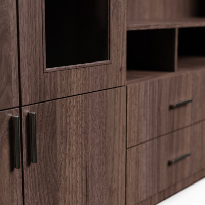 C'est un meuble TV qui peut contenir vraiment beaucoup – derrière des façades élégantes et fermées, vous cacherez toutes les choses qui ne doivent pas être visibles. Les vitrines en verre vous permettront d'exposer efficacement vos décorations préférées, et l'espace TV a été conçu pour accueillir confortablement télévision et équipements multimédias.