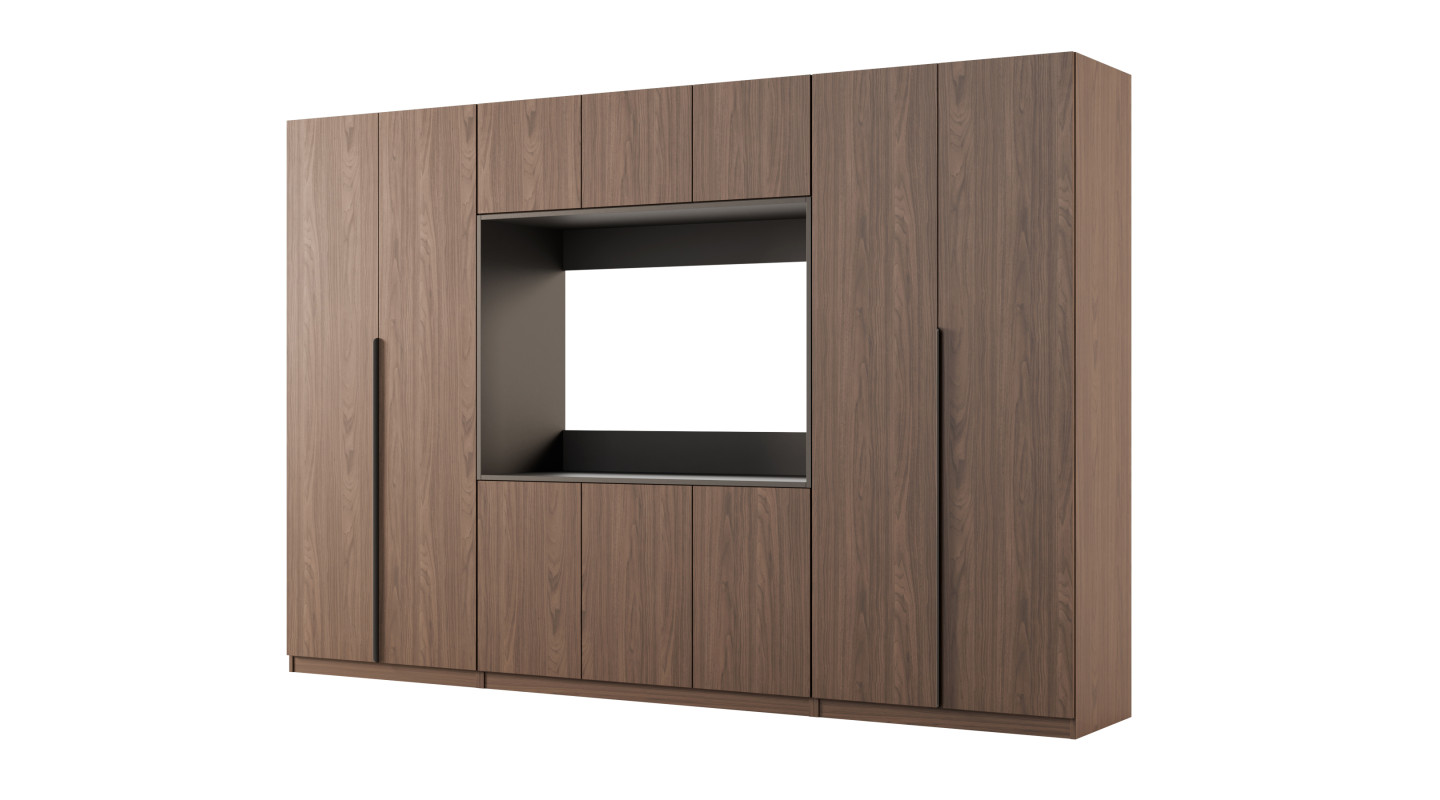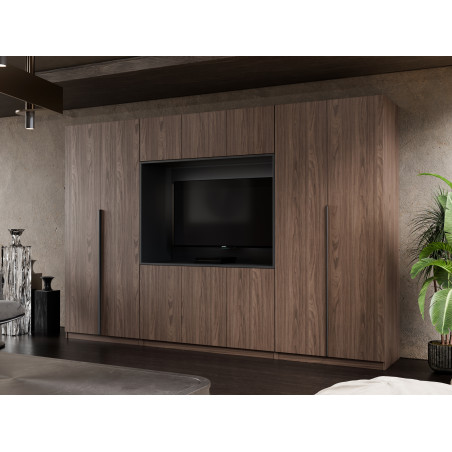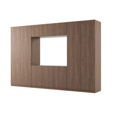 Dako est un meuble très large (3,80 m) et très haut (2,40 m). Il a des rehausseurs plus profonds que la normale (0,36 m) et des armoires (0,55 m) avec des barres à cintres, une lingerie avec 5 étagères, des vitrines en verre, des tiroirs, un bar, des niches ouvertes et fermées, et même une grande niche multimédia.