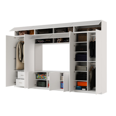 Dako est un meuble très large (3,80 m) et très haut (2,40 m). Il a des rehausseurs plus profonds que la normale (0,36 m) et des armoires (0,55 m) avec des barres à cintres, une lingerie avec 5 étagères, des vitrines en verre, des tiroirs, un bar, des niches ouvertes et fermées, et même une grande niche multimédia.