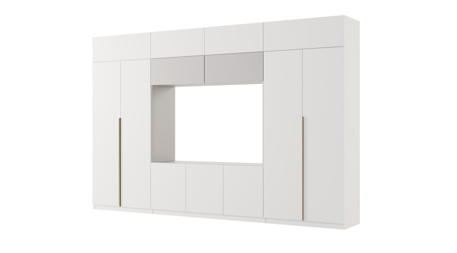 - rehausseurs fermants avec étagères sur toute la largeur de l'ensemble, grâce auxquels la hauteur totale du meuble de rangement atteint 240 cm.