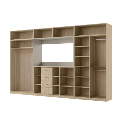 Dako est un meuble très large (3,80 m) et très haut (2,40 m). Il a des rehausseurs plus profonds que la normale (0,36 m) et des armoires (0,55 m) avec des barres à cintres, une lingerie avec 5 étagères, des vitrines en verre, des tiroirs, un bar, des niches ouvertes et fermées, et même une grande niche multimédia.