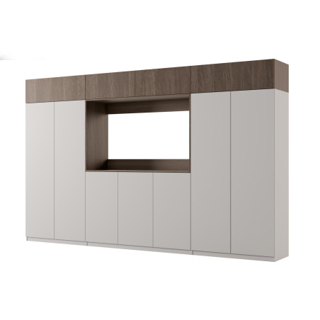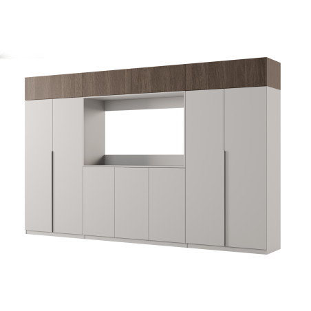 - rehausseurs fermants avec étagères sur toute la largeur de l'ensemble, grâce auxquels la hauteur totale du meuble de rangement atteint 240 cm.