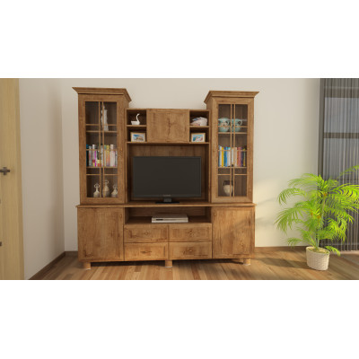 À côté de l'espace télévision se trouvent deux vitrines qui offrent un espace supplémentaire pour le rangement et l'exposition d'objets de collection. Chacune des vitrines est équipée d'étagères où vous pouvez placer divers ornements, souvenirs ou collections. Grâce aux façades vitrées, ces objets sont clairement visibles, créant un effet visuel agréable.