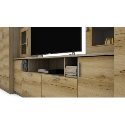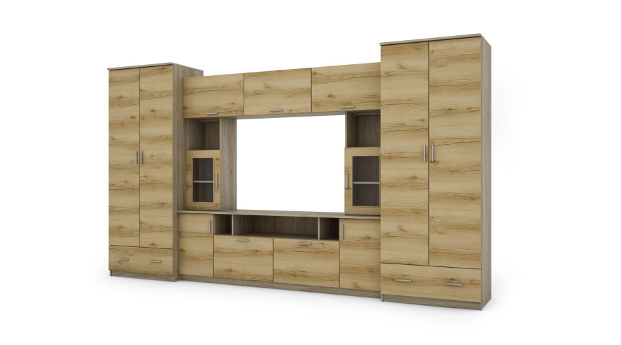Valóban nagy és funkcionális bútordarabot keres a nappalijába vagy nappali területére? Válassza a TAJGA falszekrényt, amely két szekrényből, szekrényekből, polcokból és egy TV szekrényből áll. Ez a tökéletes megoldás a ruhák, apróságok és minden más szükséges tárgy tárolására, valamint a TV berendezések kiállítására. A TAJGA falszekrény egyaránt biztosítja a funkcionalitást és az esztétikai vonzerőt.