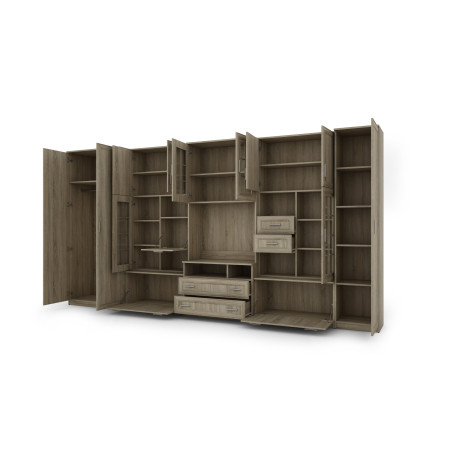 - két szekrény, amely vitrinekből, lefelé nyíló klapokból, nyitott szekrényekből, fiókokból és bárból áll.